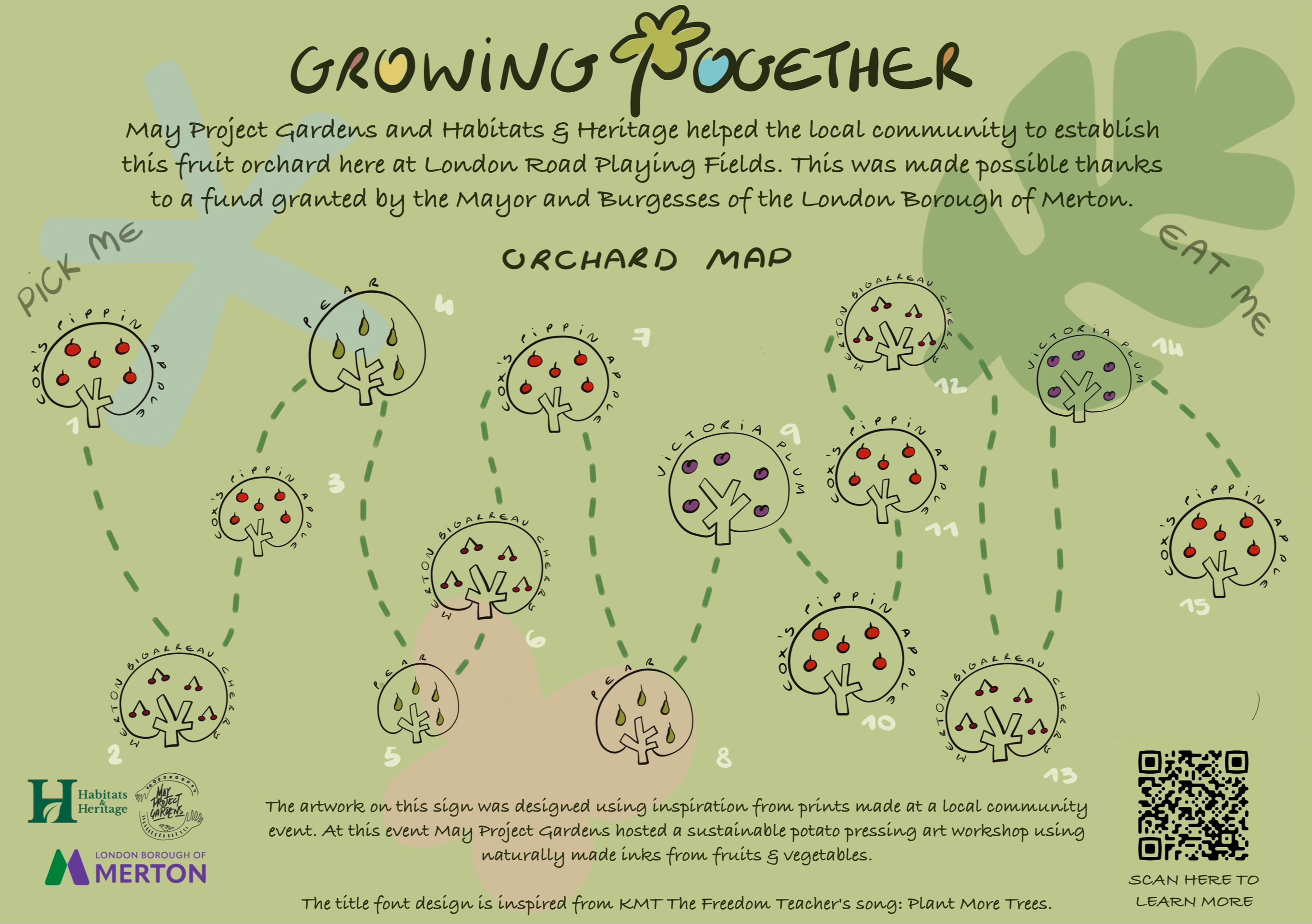 In 2022, I was part of a community project run by the charity May Project Gardens in collaboration with Habits & Heritage. The project involved planting an orchard in London Road Playing Fields - a public park located behind council estate flats in South London Mitcham. I ran an art workshop during the orchard planting event and also designed a map of the orchard so the community could easily identify the different fruit trees and find out more about the project. One of the variety of fruit trees we planted was a cherry tree.