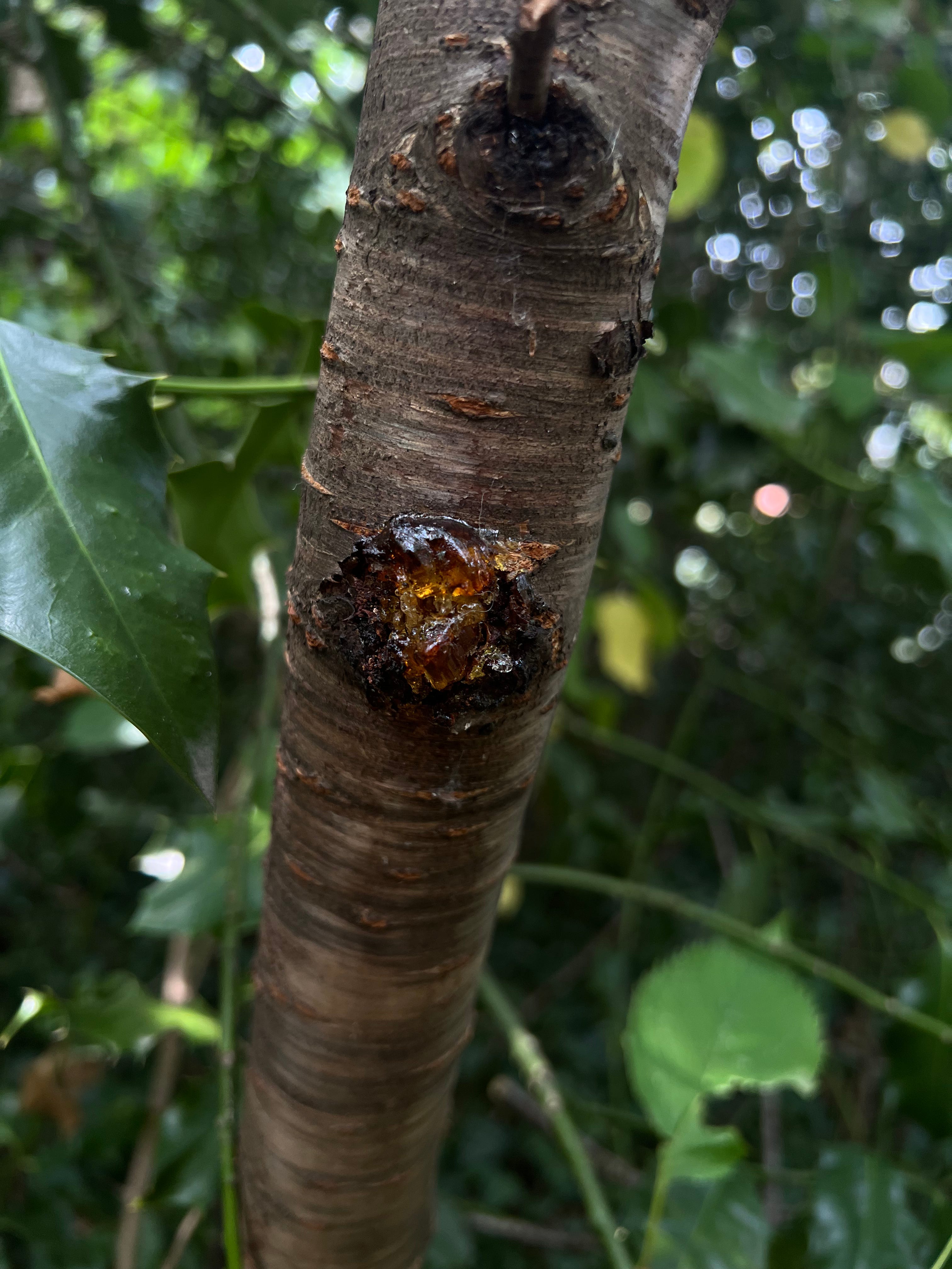 I’m broke. I didn’t have enough money to buy Gum Arabic, a natural gum produced by the Acacia tree predominately in Senegal. I usually use it as a binder for the natural inks I make with plants, food scraps and pantry items. I was running an art workshop on Saturday 16th with the charity May Project Gardens so I needed to find a solution. I look up on Google “Gum Arabic alternatives”, “how to make Gum Arabic at home”. I come across an article listing alternative trees and there it is. Cherry Tree. I run to the garden…